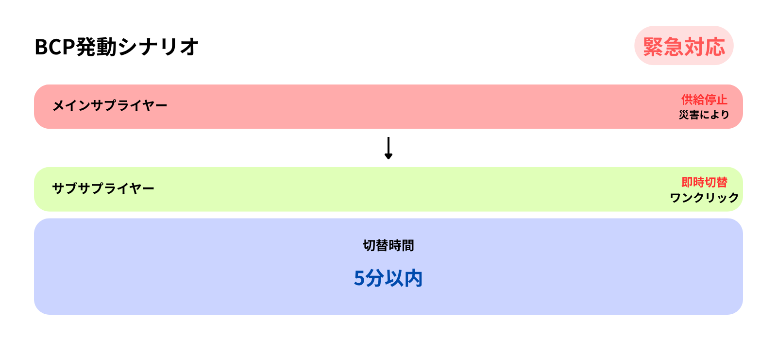 自然災害でメインサプライヤーが停止。登録済み第2サプライヤーへ即時切替え、欠品回避。