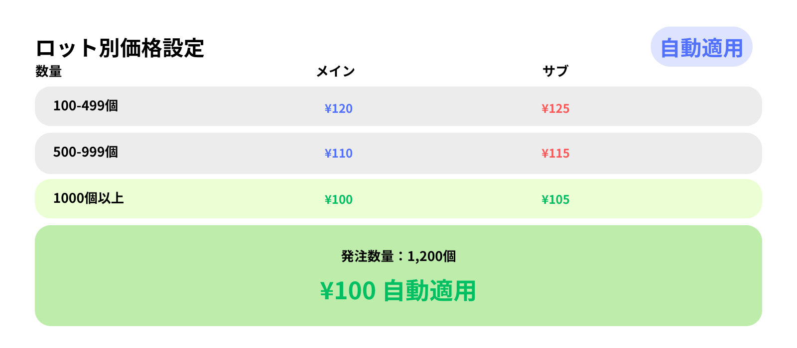 数量・ロット条件をマスタに複数登録。受注時/発注時に条件を自動適用し単価を自動割当て。